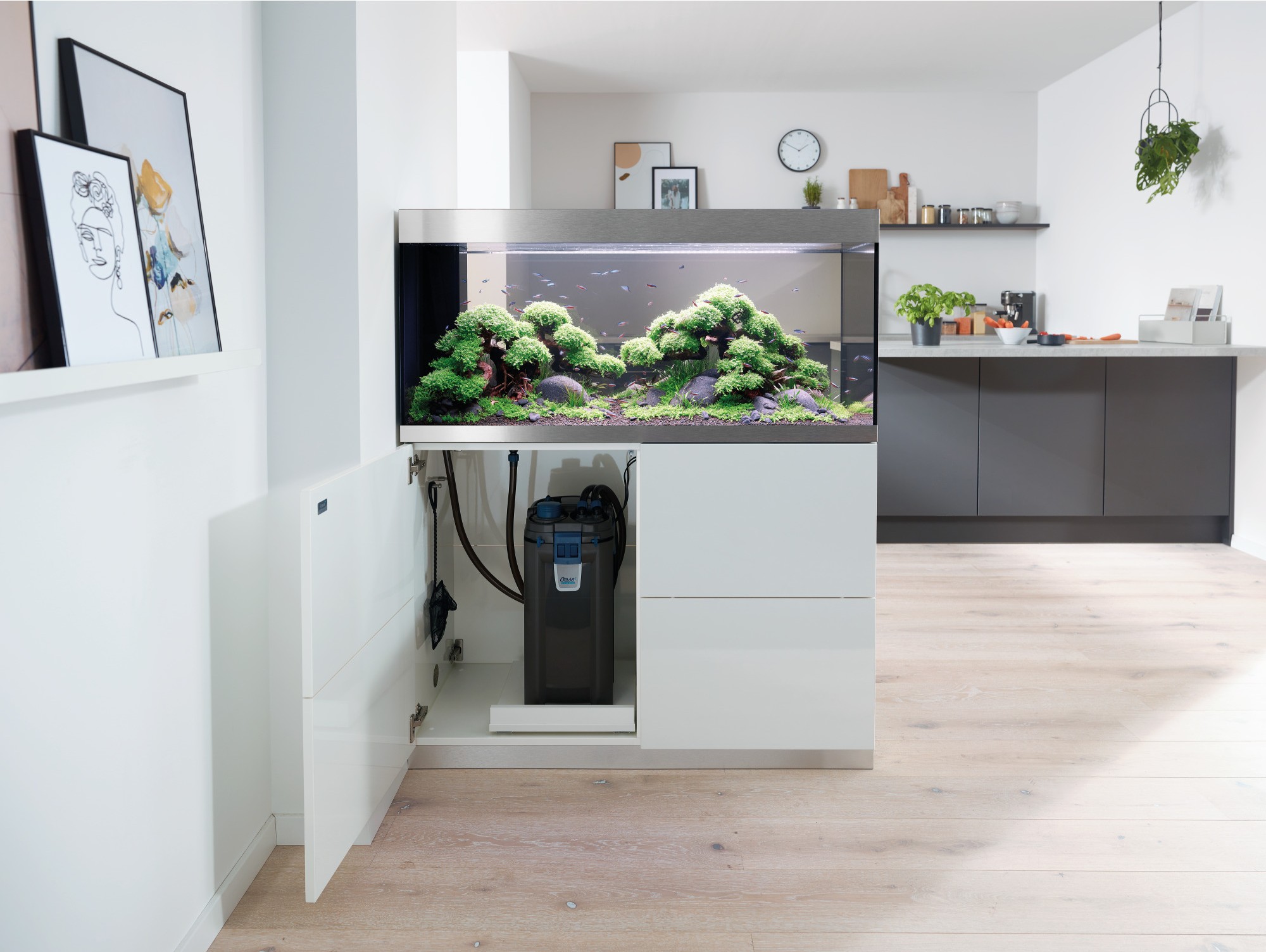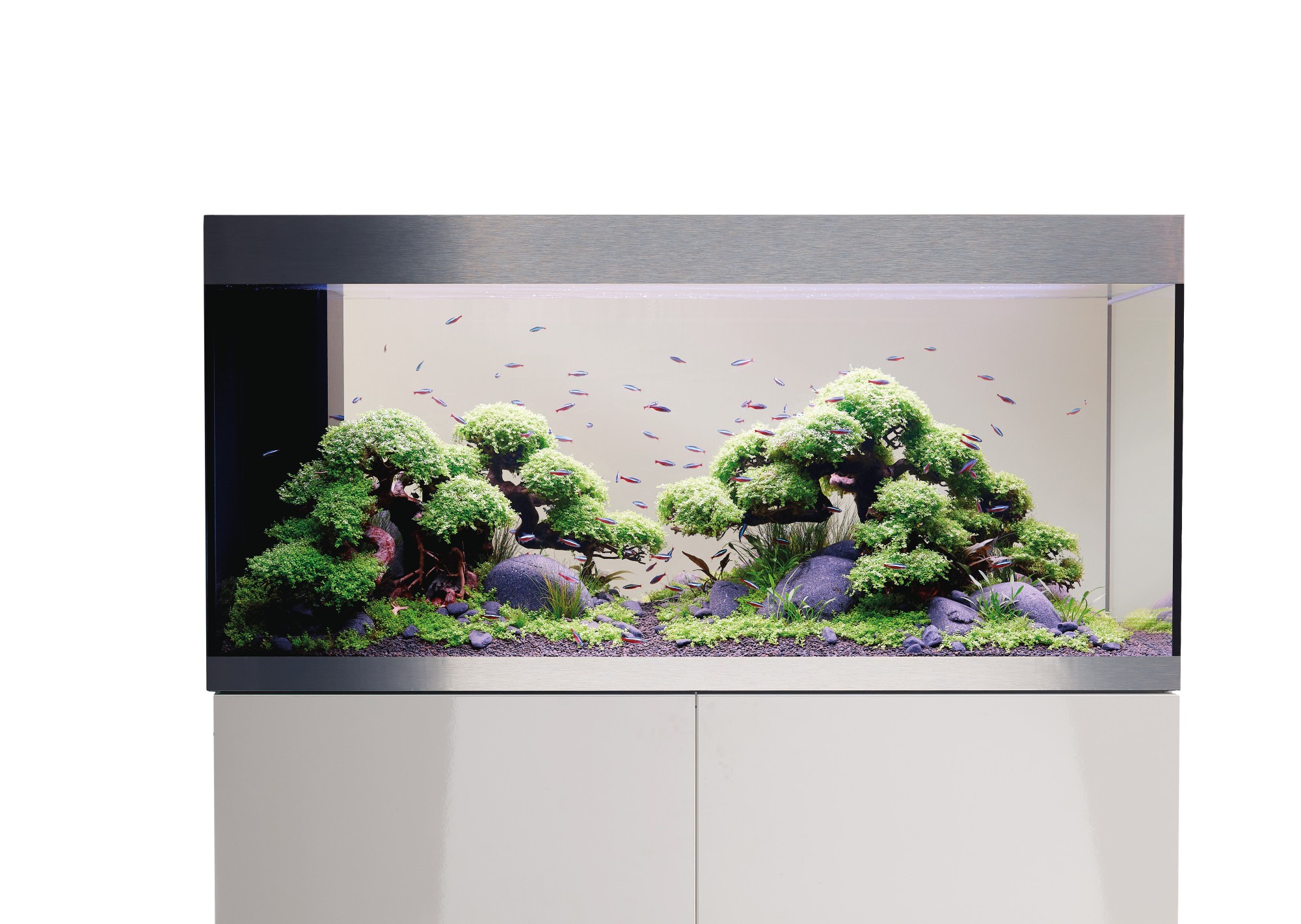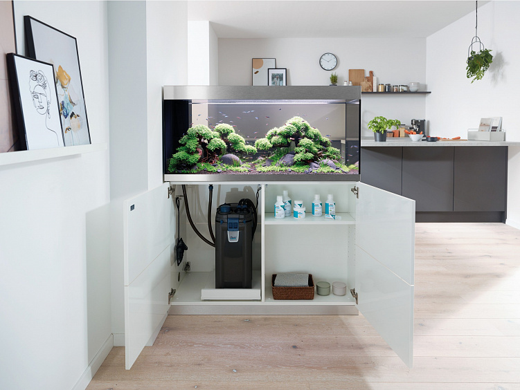 Практичная конструкция: С незаметной сухой шахтой для скрытной и аккуратной прокладки кабелей и шлангов.Высокое качество: Дверцы шкафа без ручек с функцией открывания обеспечивают великолепный дизайн, а алюминиевые полоски на аквариуме скрывают поверхность воды.