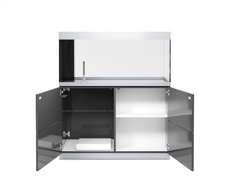 Практичная конструкция: С незаметной сухой шахтой для скрытной и аккуратной прокладки кабелей и шлангов.Высокое качество: Дверцы шкафа без ручек с функцией открывания обеспечивают великолепный дизайн, а алюминиевые полоски на аквариуме скрывают поверхность воды.