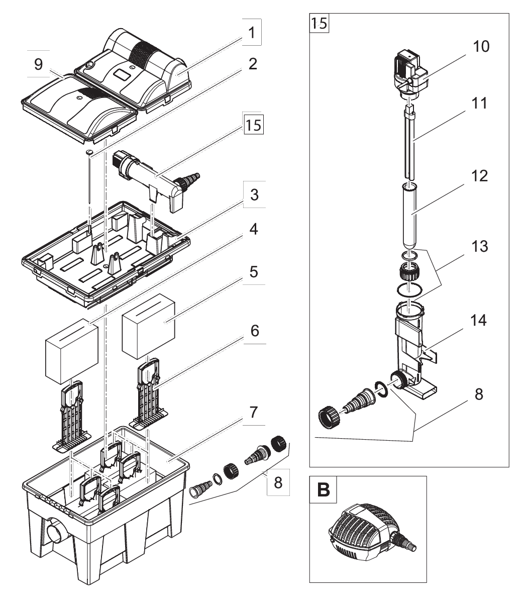 Комплект системы фильтрации состоящий из проточного фильтра, УФ лампы и насоса