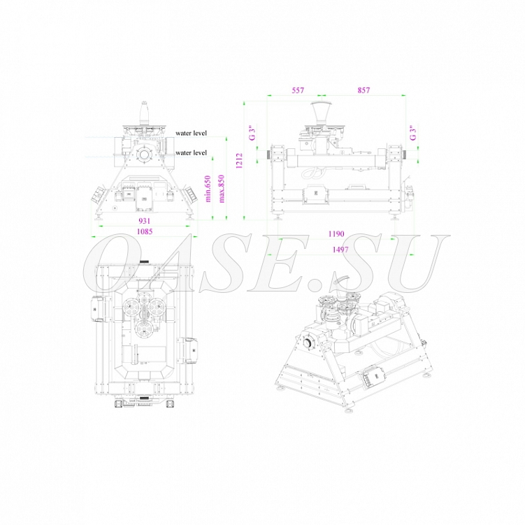 - Парковочное положение: форсунку можно полностью спрятать под поверхностью воды на уровне воды 850 мм с диапазоном поворота 150 ° по осям X и Y.