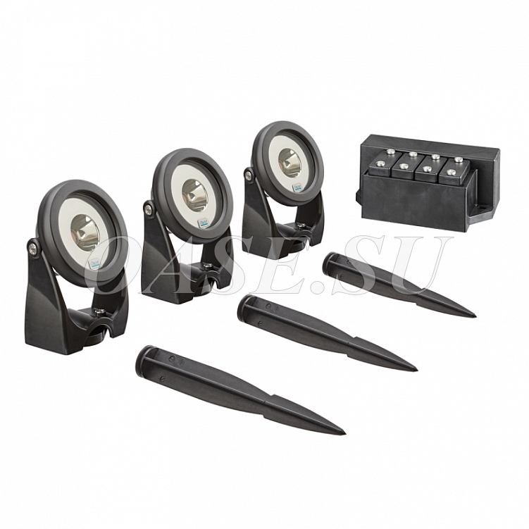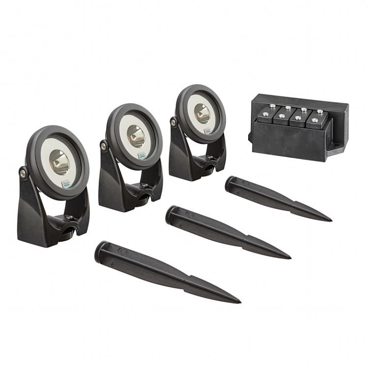 - Входит в объем поставки: 1 или 3 прожектора, каждый с 5 м кабелем, светодиодный драйвер с возможность подключения до 4 светильников, а также 1 или 3 стержня для монтажа в грунт