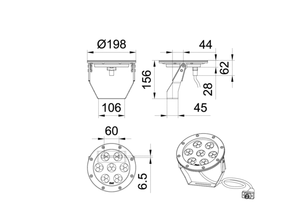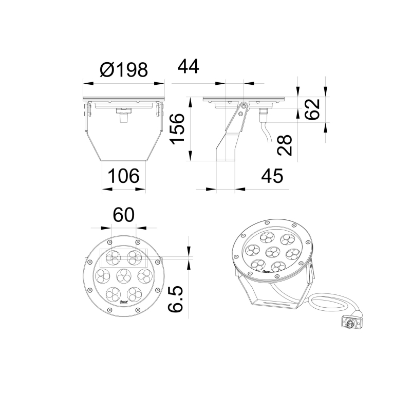 - Размеры корпуса лампы: (Ø x В) 198 x 156 [мм]