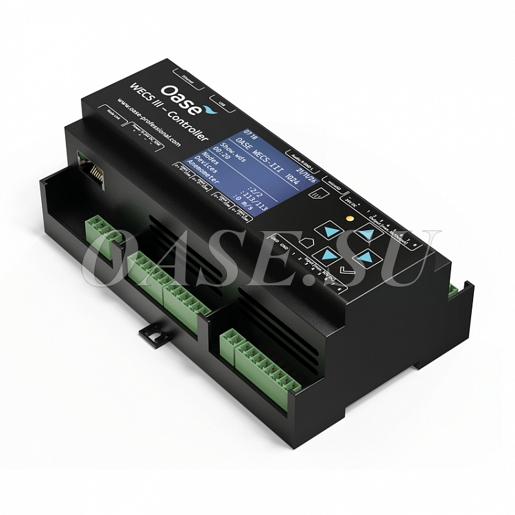 WECS III 1024/DMX/02 - это новый развлекательный контроллер от OASE для 1024 каналов DMX-RDM с аудиофайлом. С помощью контроллера WECS III (Система управления водными развлечениями) шоу фонтанов можно свободно программировать и воспроизводить в желаемой временной шкале, синхронизированной с музыкой до секунды. Контроллер отправляет пакеты данных DMX-RDM отдельным компонентам (светильникам, насадкам, управляемым DMX-RDM, и т.д.), Чтобы эти компоненты могли соответствующим образом работать. Эти компоненты, т.е. участники анализируют данные и со своей стороны отправляют обратно данные, такие как часы работы и температура, по той же линии. С помощью запросов о состоянии возможна удаленная диагностика и удаленное обслуживание участвующих компонентов. На карте microSD может быть сохранено любое количество показов или последовательностей для проекта.