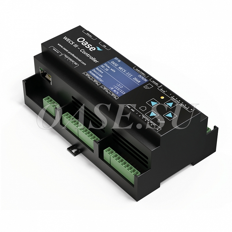 WECS III 2048/DMX/02 - это новый развлекательный контроллер от OASE для 2048 каналов DMX-RDM с аудиофайлом. С помощью контроллера WECS III (Система управления водными развлечениями) шоу фонтанов можно свободно программировать и воспроизводить в желаемой временной шкале, синхронизированной с музыкой до секунды. Контроллер отправляет пакеты данных DMX-RDM отдельным компонентам (светильникам, насадкам, управляемым DMX-RDM, и т.д.), Чтобы эти компоненты могли соответствующим образом работать. Эти компоненты, т.е. участники анализируют данные и со своей стороны отправляют обратно данные, такие как часы работы и температура, по той же линии. С помощью запросов о состоянии возможна удаленная диагностика и удаленное обслуживание участвующих компонентов. На карте microSD может быть сохранено любое количество показов или последовательностей для проекта.