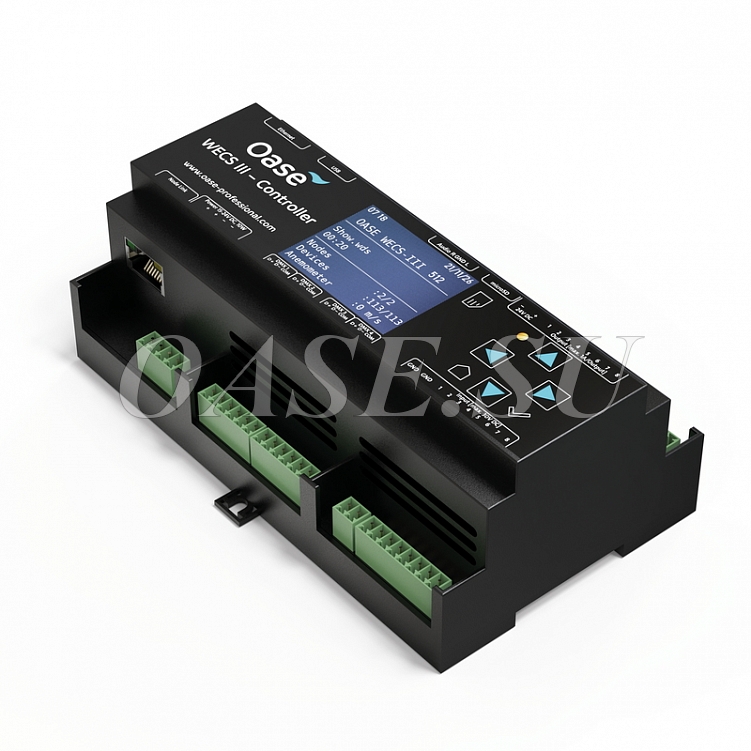WECS III 512/DMX/02 - это новый развлекательный контроллер от OASE для 512 каналов DMX-RDM. С помощью контроллера WECS III (Система управления водными развлечениями) шоу фонтанов можно свободно программировать и воспроизводить в желаемой временной шкале, синхронизированной со второй. Контроллер отправляет пакеты данных DMX-RDM отдельным компонентам (светиникам, насадкам, управляемым DMX-RDM, и т.д.), Чтобы эти компоненты могли соответствующим образом работать. Эти компоненты, то есть участники, анализируют данные и со своей стороны отправляют обратно данные, такие как часы работы и температура, по той же линии. С помощью запросов о состоянии возможна удаленная диагностика и удаленное обслуживание участвующих компонентов. На карте microSD может быть сохранено любое количество показов или последовательностей для проекта.