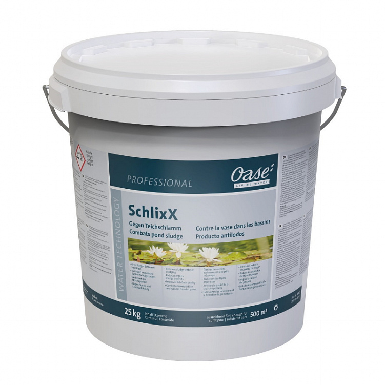 Листья и другие органические ингредиенты часто оседают на дне и образуют слой ила, в котором хранится много свободных питательных веществ, особенно фосфата, который является важным источником питательных веществ для водорослей. SchlixX работает двумя способами: Он связывает фосфат и постоянно превращает его в нерастворимый минерал апатит, выделяя кислород. Микроорганизмы в воде используют это для расщепления органического материала. В то же время это связывание также лишает водоросли питательных веществ в воде, чтобы остановить рост. Это значительно уменьшает количество осадка и обеспечивает правильный объем воды. Вероятность цветения синих водорослей также снижается.