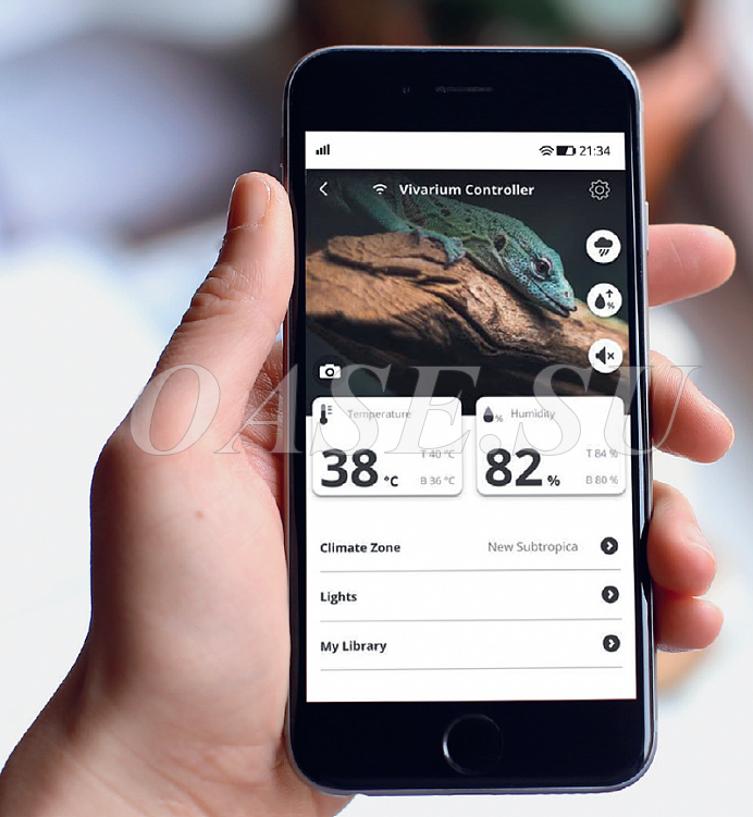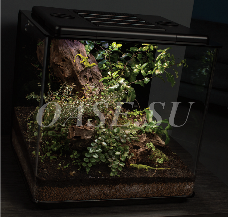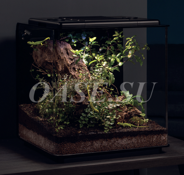 Функция туманообразования обеспечивает необходимую влажность, которая играет важную роль в террариуме. Благодаря этому в террариуме можно имитировать дождь и звуки джунглей. Однако одними из наиболее важных функций являются нагревание и охлаждение, обеспечиваемые пластиной подогрева пола для поддержания стабильной и равномерной температуры.