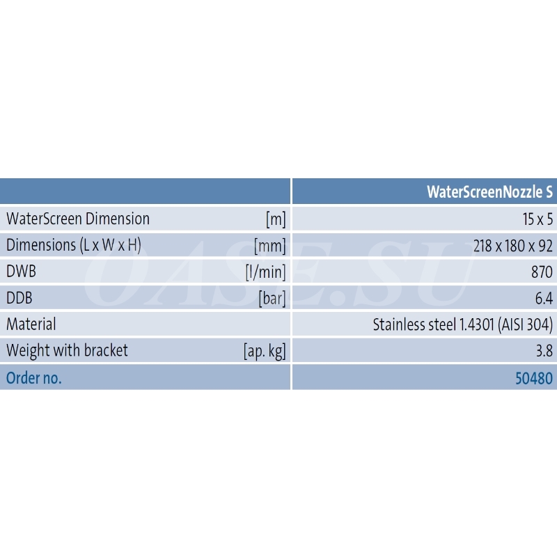 Насадка водный экран - Water screen nozzle S Размеры водного экрана (м) 5,0 х 15,0