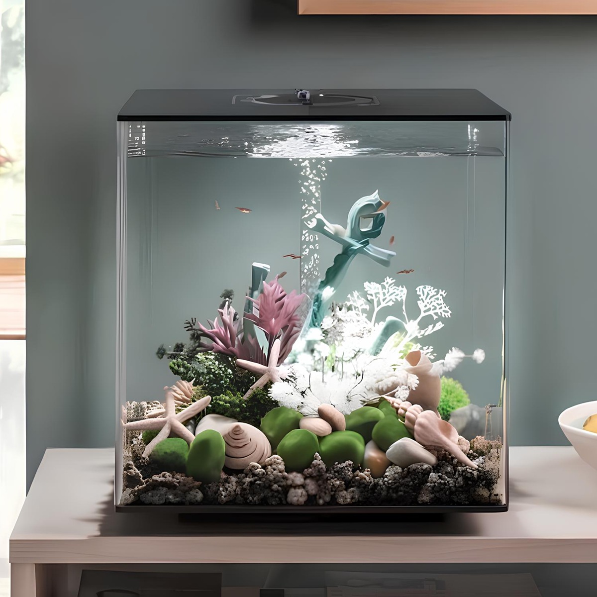 - Квадратный аквариум со светодиодной подсветкой белого цвета