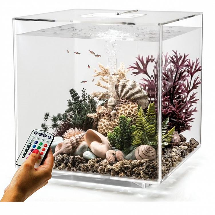 Серия biOrb CUBE это классические аквариумы квадратной формы с цветной светодиодной подсветкой (16 цветов) и пультом дистанционного управления.