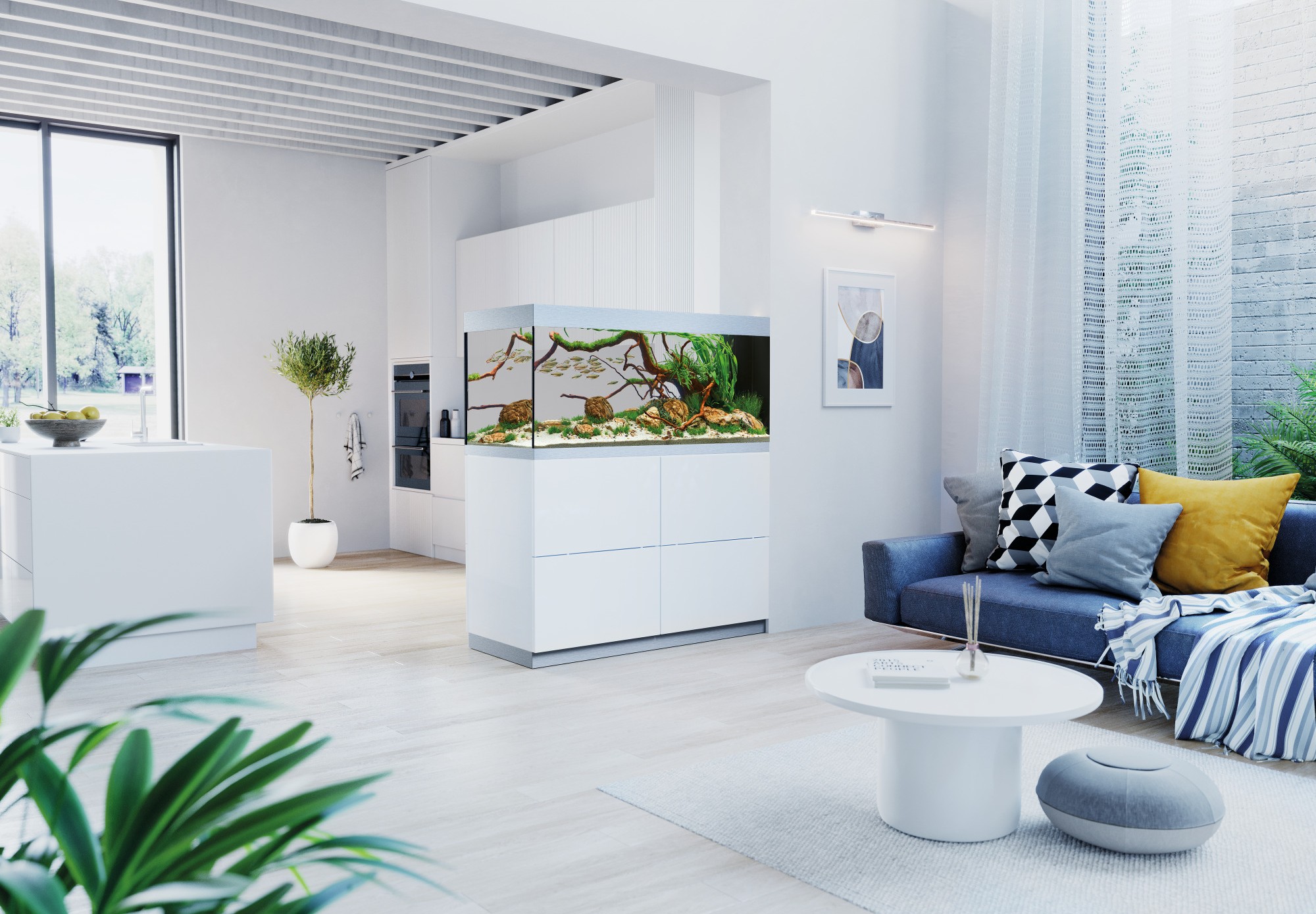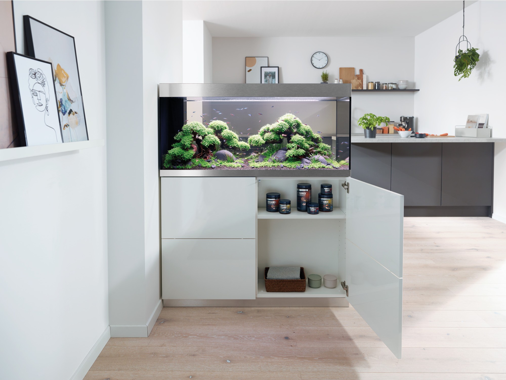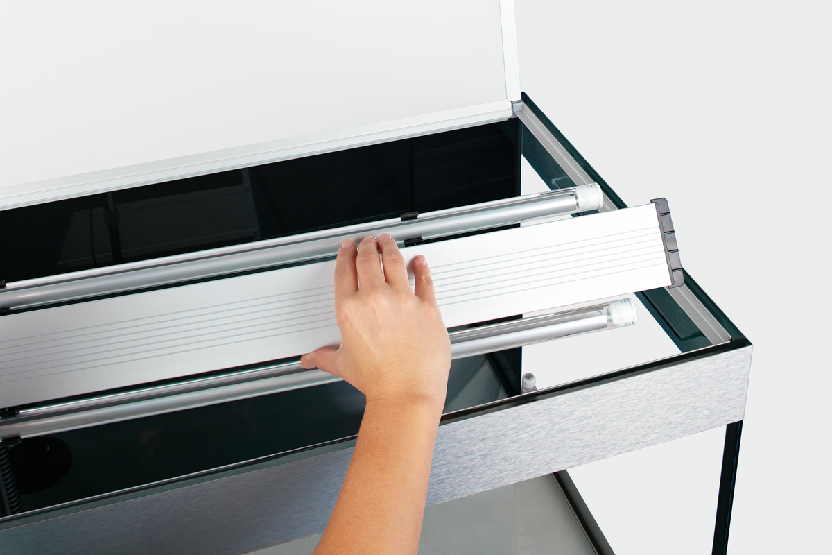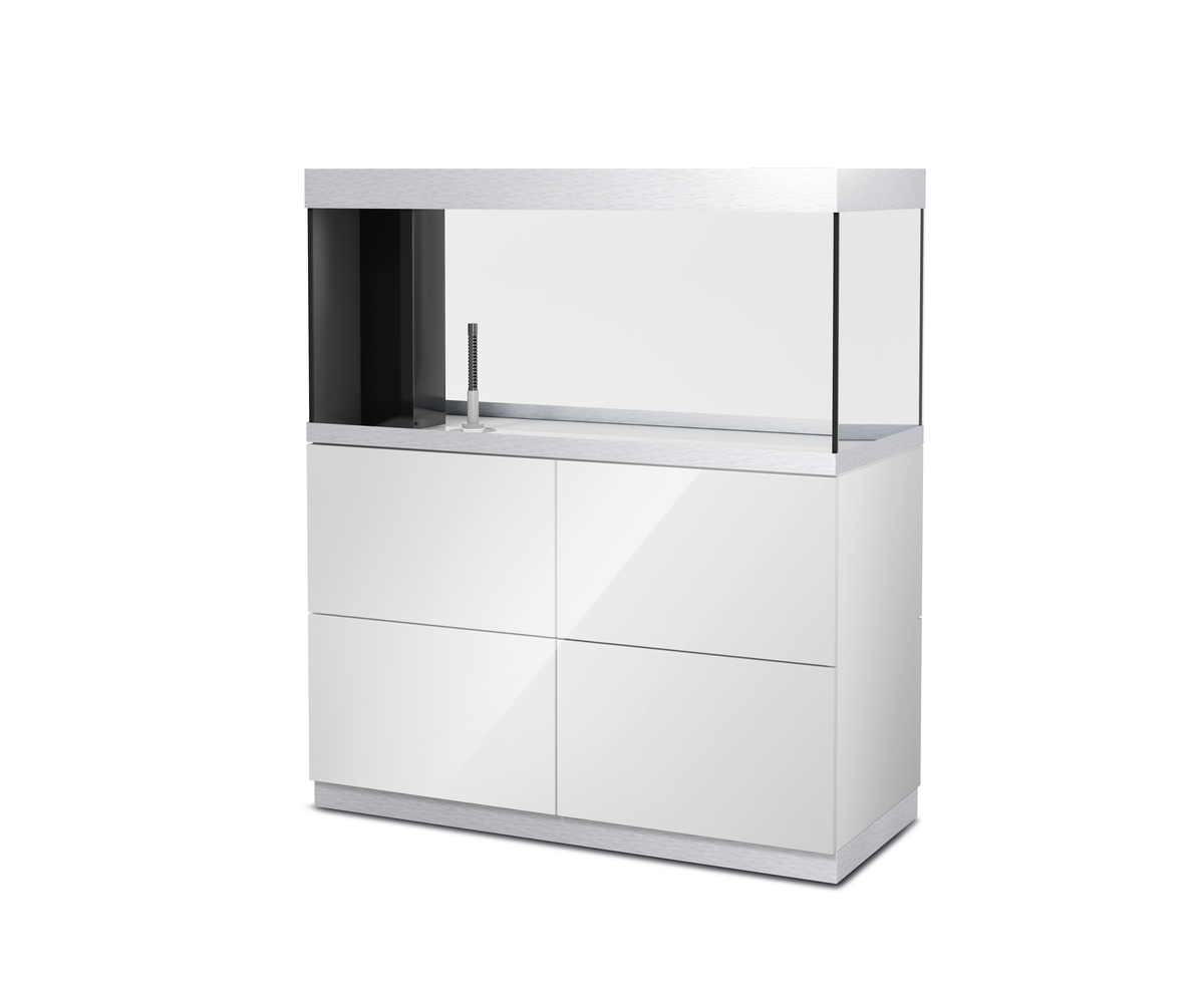 Практичная конструкция: С незаметной сухой шахтой для скрытной и аккуратной прокладки кабелей и шлангов.Высокое качество: Дверцы шкафа без ручек с функцией открывания обеспечивают великолепный дизайн, а алюминиевые полоски на аквариуме скрывают поверхность воды.