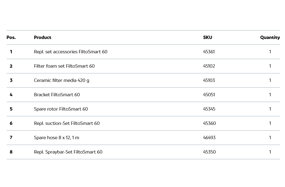 Полный комплект для быстрого запуска: включает фильтрующий материал, шланги, переходники, всасывающую и напорную трубы, а также диффузор для воды.