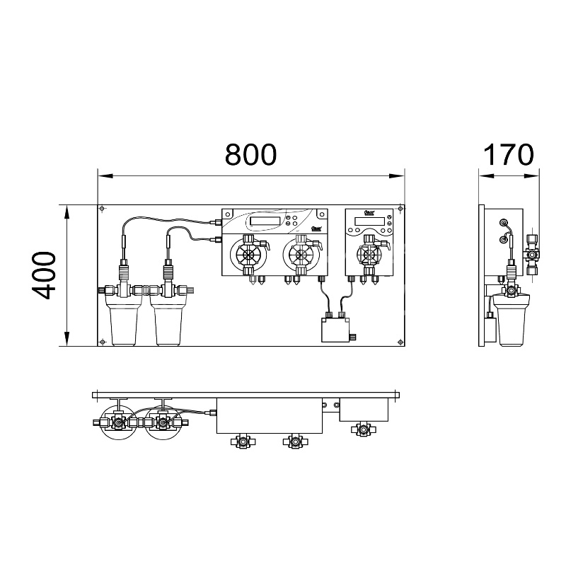 - Простая, надежная система с дозирующими насосами и контрольными приборами.