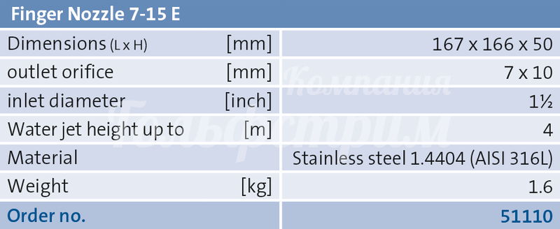 Фонтанная насадка Finger Nozzle 7-15 E генерирует семь отдельных водных струй диаметром 10мм.