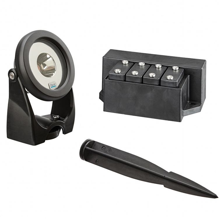 - Входит в объем поставки: 1 или 3 прожектора, каждый с 5 м кабелем, светодиодный драйвер с возможность подключения до 4 светильников, а также 1 или 3 стержня для монтажа в грунт