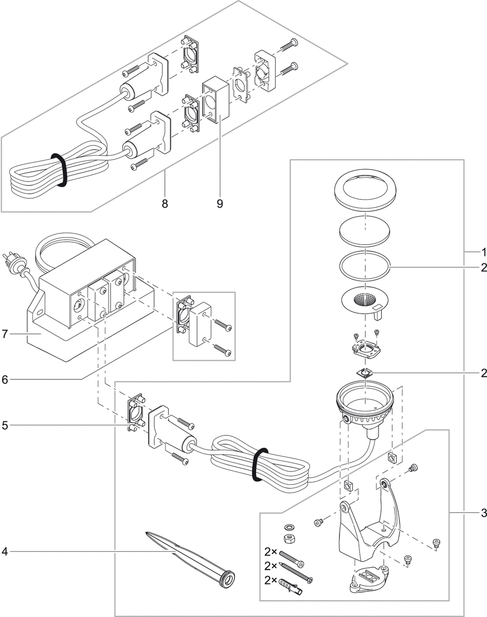 - Входит в объем поставки: 1 или 3 прожектора, каждый с 5 м кабелем, светодиодный драйвер с возможность подключения до 4 светильников, а также 1 или 3 стержня для монтажа в грунт