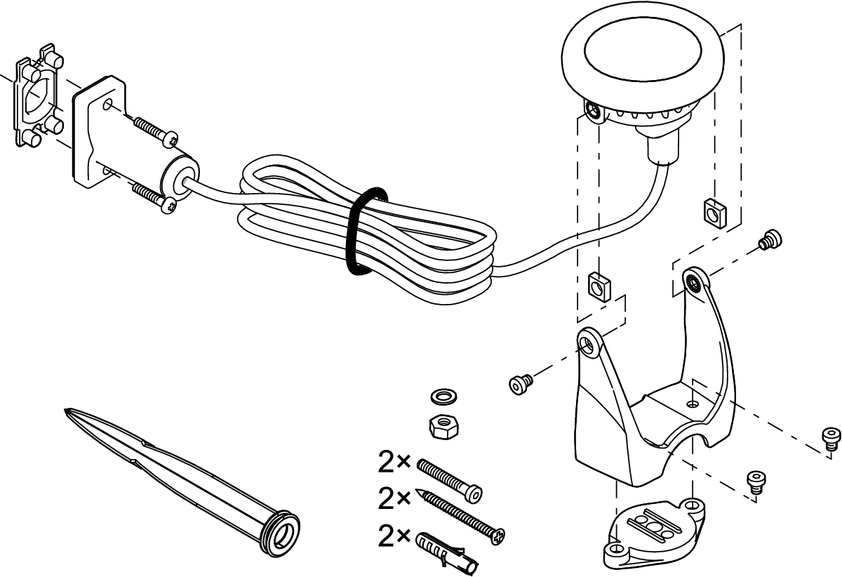 - В комплект поставки входит: 1 прожектор с кабелем длиной 5 м и 1 заземляющий столб.