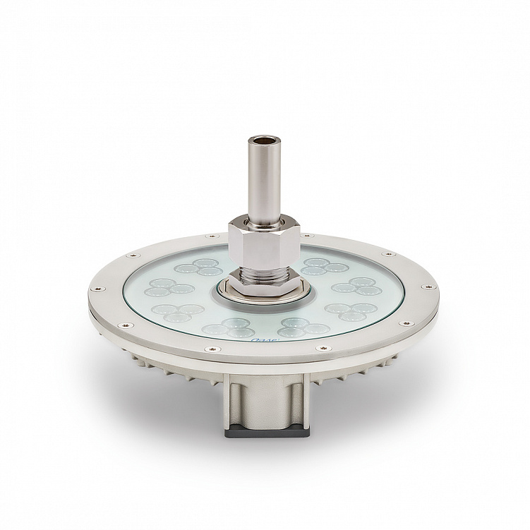 Энергоэффективная светодиодная подсветка RGB с отверстием в центре D = 51,6 мм для сменной входной резьбы 1 "или 1,5" (LED XL EasyFit 10 / LED XL EasyFit 15) для прямого монтажа насадки или для сменного входного отверстия для кластерной насадки (EasyFit Noz ) (заказываются отдельно).
