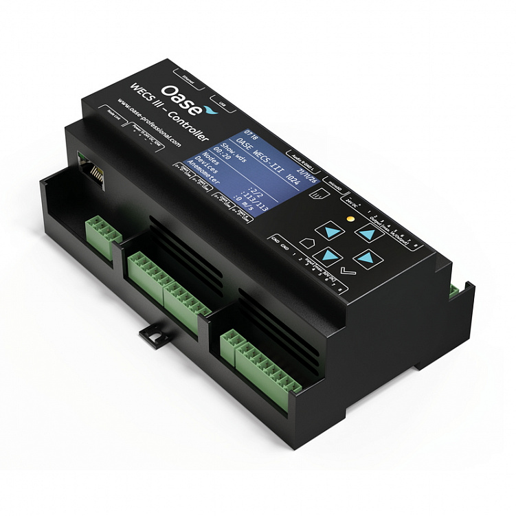WECS III 1024/DMX/02 - это новый развлекательный контроллер от OASE для 1024 каналов DMX-RDM с аудиофайлом. С помощью контроллера WECS III (Система управления водными развлечениями) шоу фонтанов можно свободно программировать и воспроизводить в желаемой временной шкале, синхронизированной с музыкой до секунды. Контроллер отправляет пакеты данных DMX-RDM отдельным компонентам (светильникам, насадкам, управляемым DMX-RDM, и т.д.), Чтобы эти компоненты могли соответствующим образом работать. Эти компоненты, т.е. участники анализируют данные и со своей стороны отправляют обратно данные, такие как часы работы и температура, по той же линии. С помощью запросов о состоянии возможна удаленная диагностика и удаленное обслуживание участвующих компонентов. На карте microSD может быть сохранено любое количество показов или последовательностей для проекта.