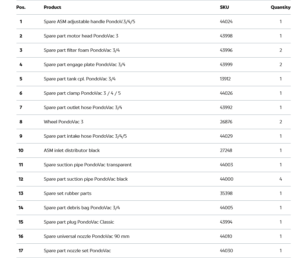 - В комплект поставки входит: 4 всасывающие трубы (пластик), насадка для удаления водорослей, насадка щетка, универсальная насадка, мешок для сбора мусора, всасывающий шланг длиной 4м, сливной шланг 2,5 м